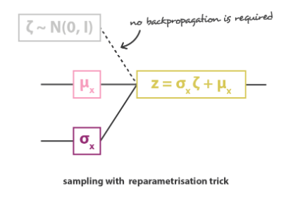 - 在 VAE 中,Encoder生成的潜在表示是一个概率分布,然后再从这个概率分布中进行随机采样,通过Decoder生成数据,这个随机采样操作本身是不可导的,也就不能进行反向传播和梯度下降等优化方法来更新参数。