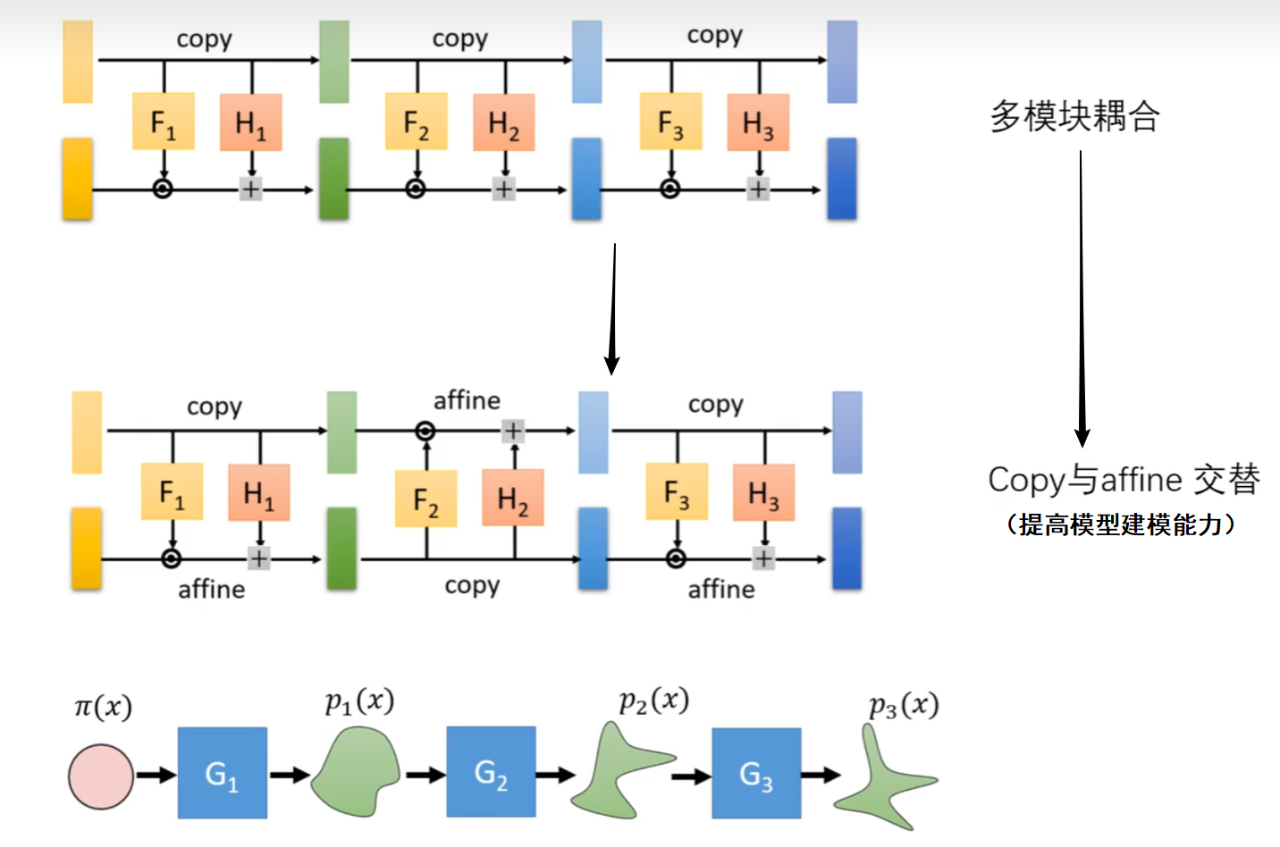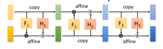 基本思想是将输入数据分成两部分,一部分保持不变,另一部分则在前一部分的条件下进行变换。这种设计确保了变换的可逆性,即可以从输出数据精确地恢复原始输入数据。