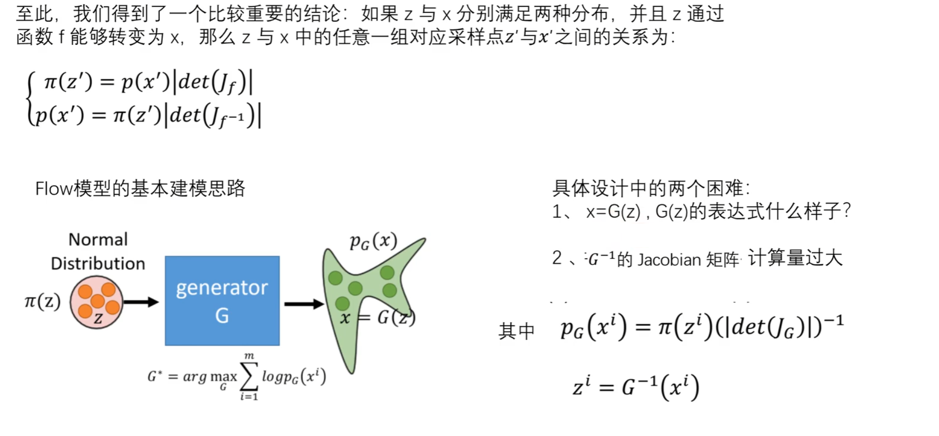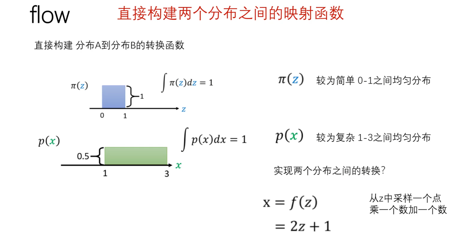 如果这个变换函数能找到的话,那么就实现了一个生成模型的构造。如果想要有新的生成,只需要从π(z)中随机采样一个点,然后通过映射f,就可以得到新的样本点x。