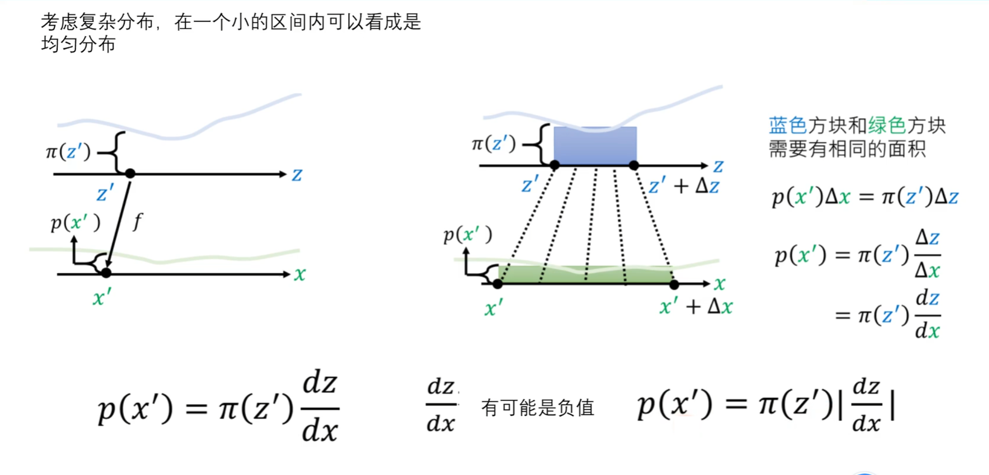要将蓝色方块分布转换为绿色方块分布,前提必须保证蓝色方块和绿色方块面积一样