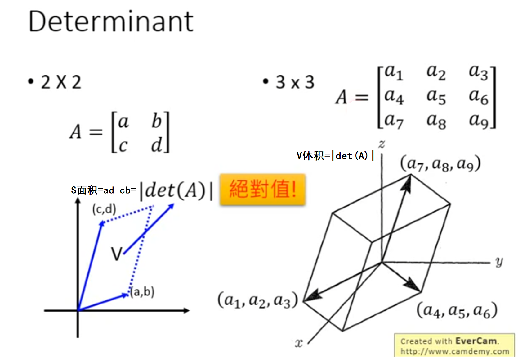 - 三维:若存在向量(a1,a2,a3),(a4,a5,a6),(a7,a8,a9)则它们的行列式的值代表构成的三维空间的体积