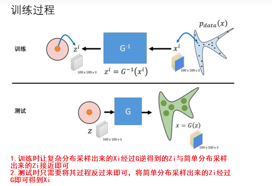 给定两组数据z和x,其中z服从已知的简单先验分布π(z)(通常是高斯分布),x服从复杂的分布p(x)(即训练数据代表的分布),现在需要找到一个变换函数f,它能建立一种z到x的映射f。