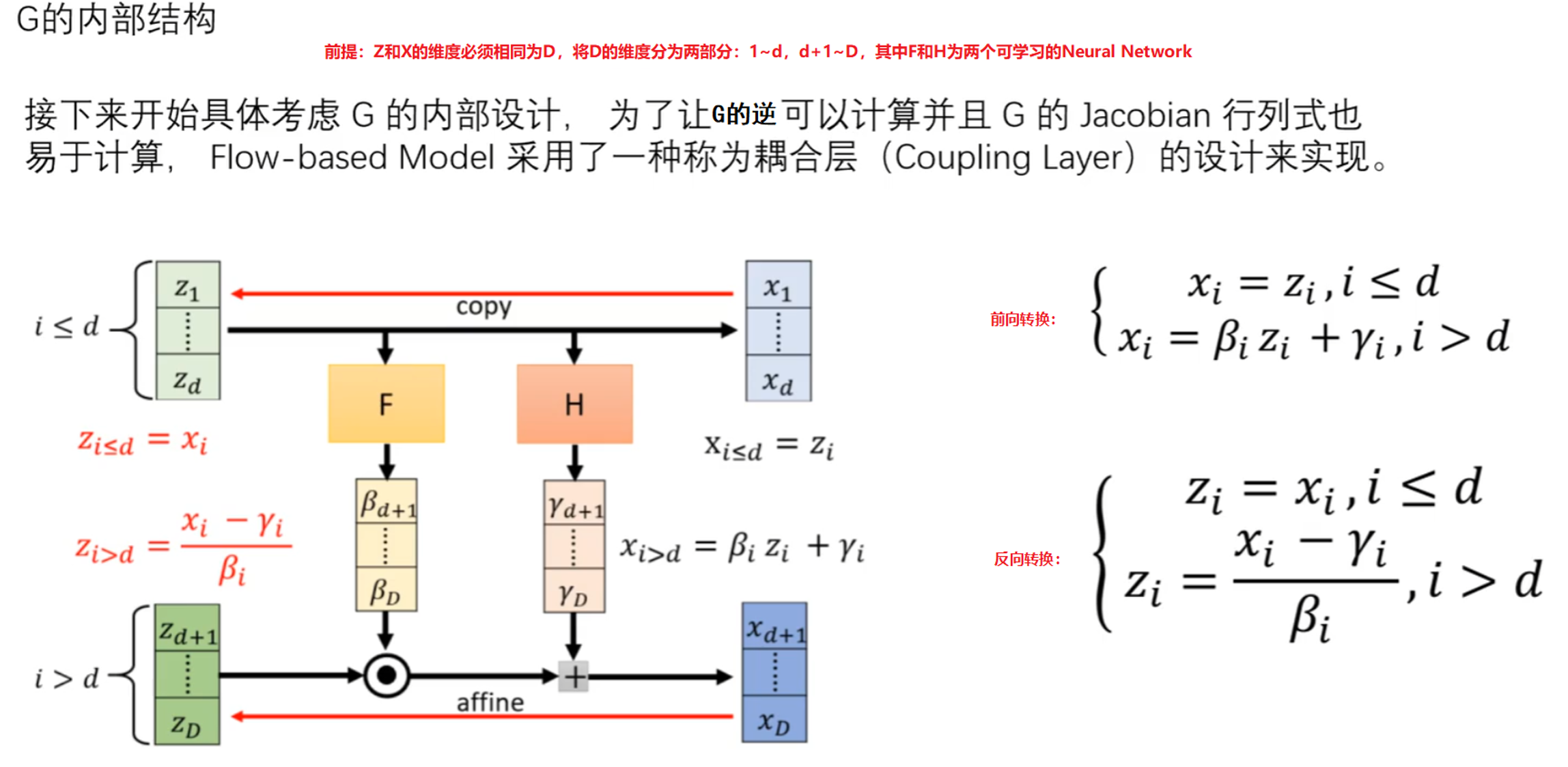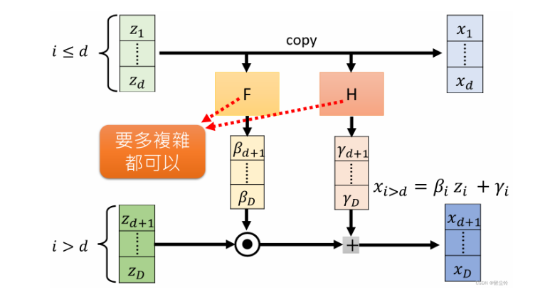 注意:其中的s( · )和t( · )可以采用复杂的neural network来增加转换的复杂性,使得模型能够学习复杂的数据分布并保持变换的可逆性。