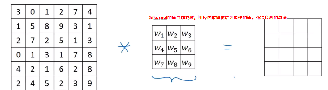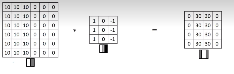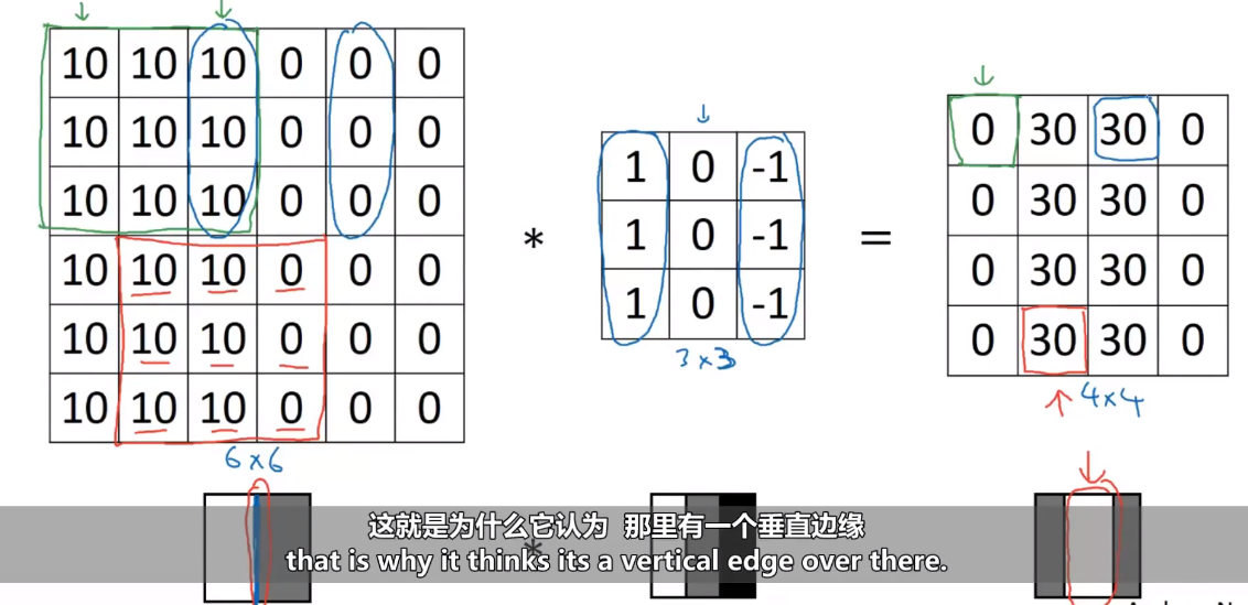 给出3×3卷积核,试图找出中间的垂直边缘,卷积核左边列对应是6×6的亮像素部分,右边列对应暗像素部分,不需要关注中间有什么,卷积的最终结果就可以找到图像的垂直边缘