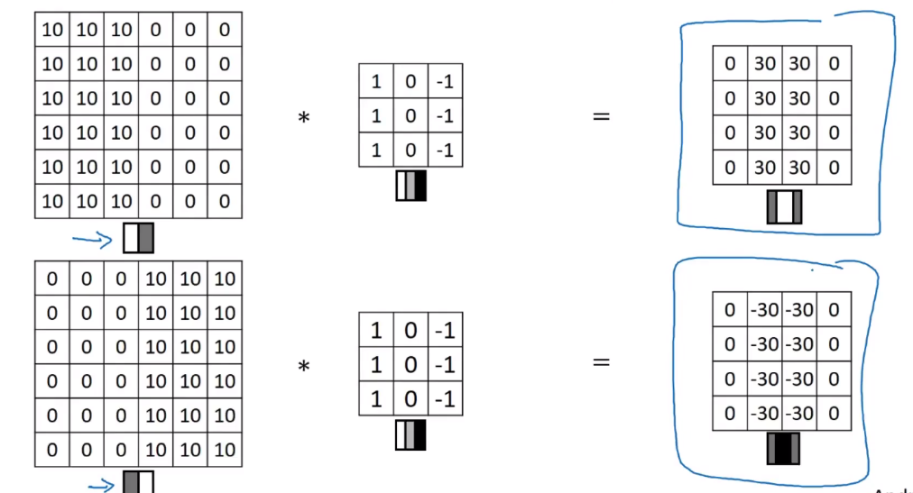 若用相同的kernel对左右亮度交换后的6×6图像进行垂直边缘探测,探测出来的垂直边缘结果会比之前的更暗