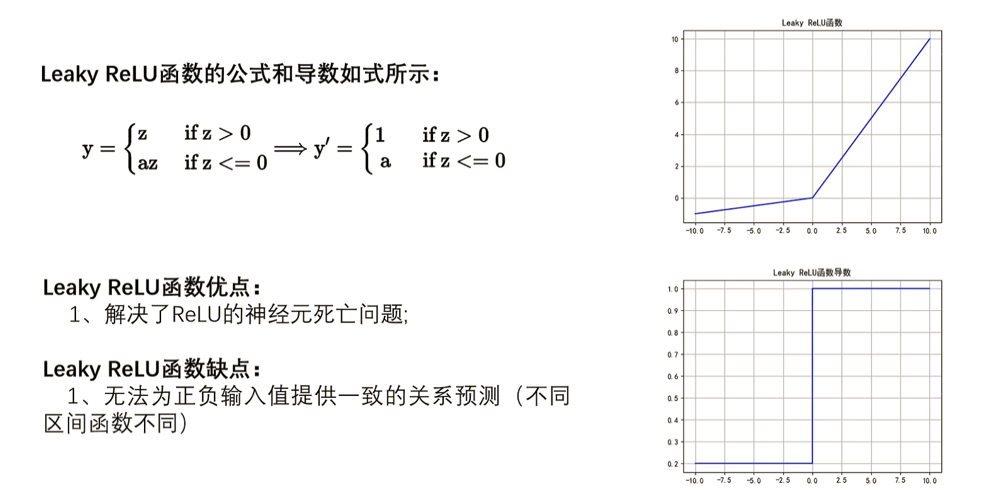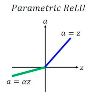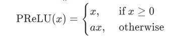 不同在于系数 a 是需要学习的参数,负责控制负半轴的斜率。若学得的 a=0 ,那么 PReLU 退化为 ReLU;若学得的 a是一个很小的固定值(如 a=0.01 ),则 PReLU退化为 Leaky ReLU。
