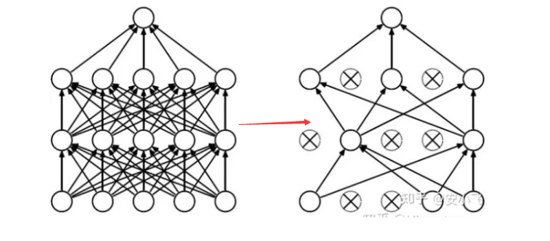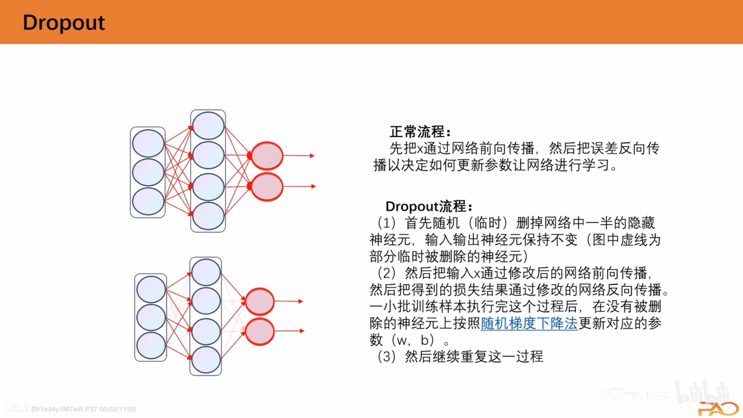 (1)首先随机(临时)删掉网络中一半的隐藏神经元,输入输出神经元保持不变