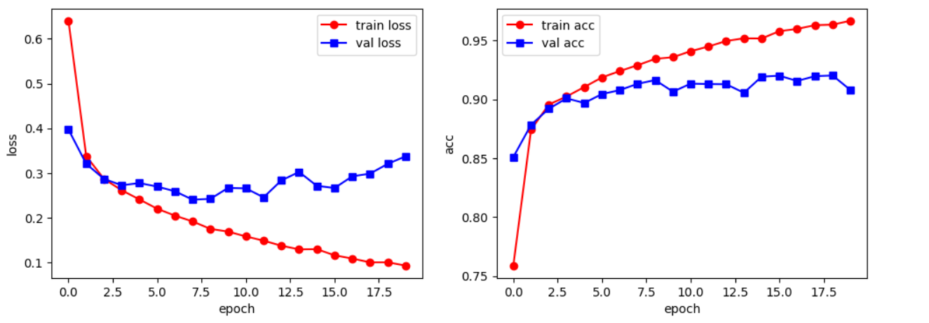 注意:从loss曲线可以看出,在10轮过后,模型开始出现过拟合的现象