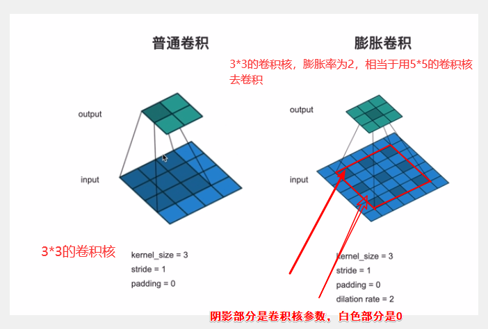 。一个扩张率为2的3×3卷积核,感受野与5×5的卷积核相同,但参数数量仅为9个,是5×5卷积参数数量的36%。