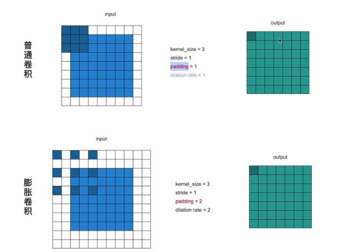 ,保持参数个数不变的情况下增大了卷积核的感受野,让每个卷积输出都包含较大范围的信息;同时它可以保证输出的特征映射(feature map)的大小保持不变